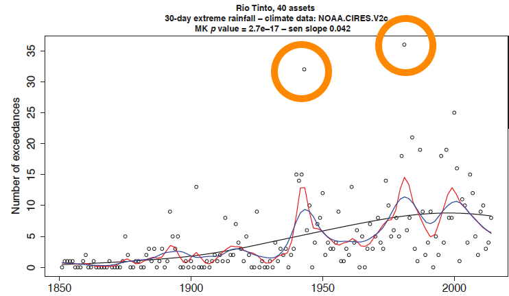 Time series of the yearly number of 30-day extreme rainfall events exceeding the 10-year return level for the Rio Tinto portfolio computed using the 20CR dataset, using 3 windows (11, 21, and 114 years) to illustrate different aspects of long-term variability (Bonnafous, Lall, and Siegel 2017)