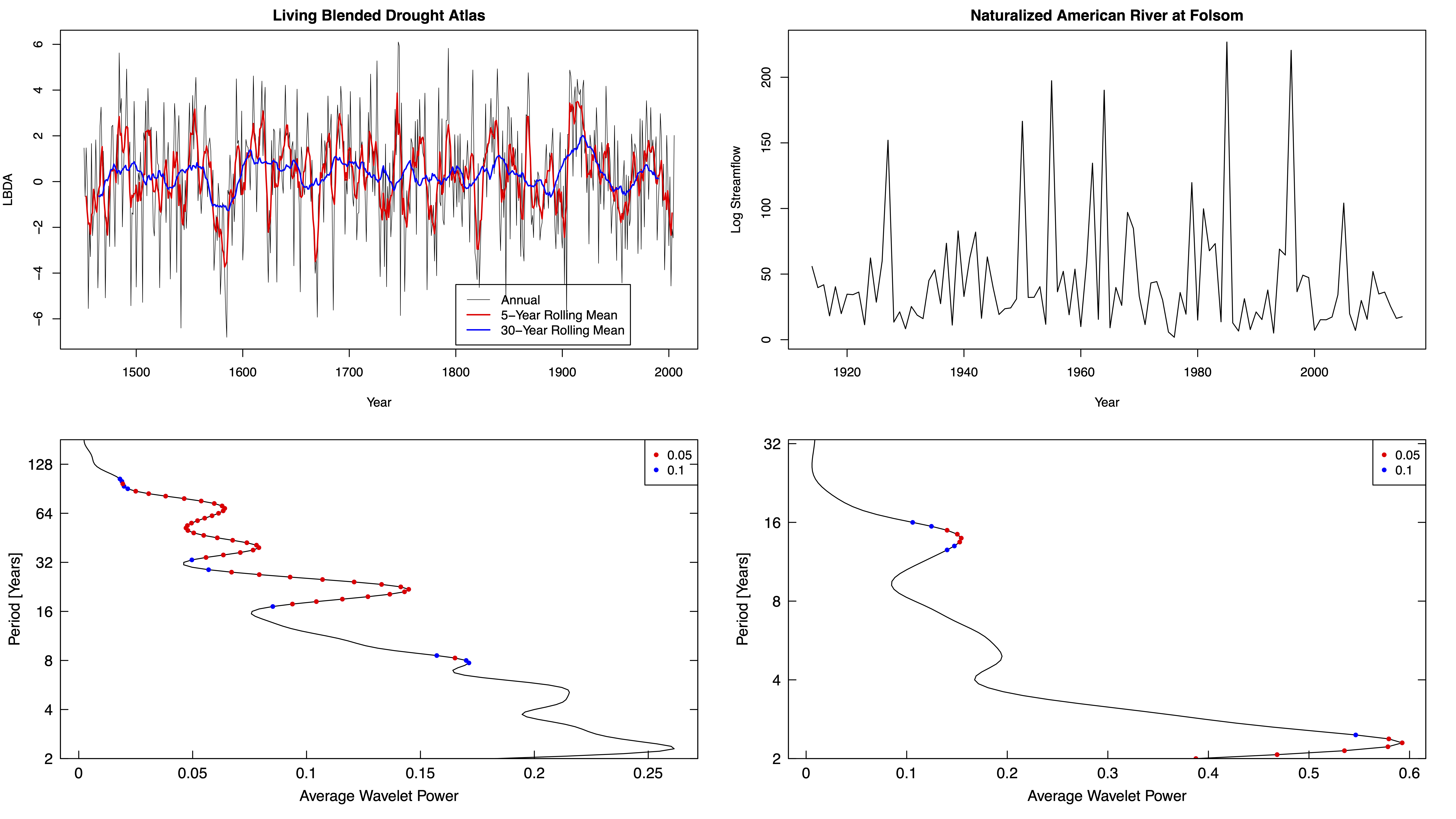 Global wavelet analysis of two (L) living Blended Drought Analysis and (B) Naturalized American River at Folsom (Doss-Gollin et al. 2019)