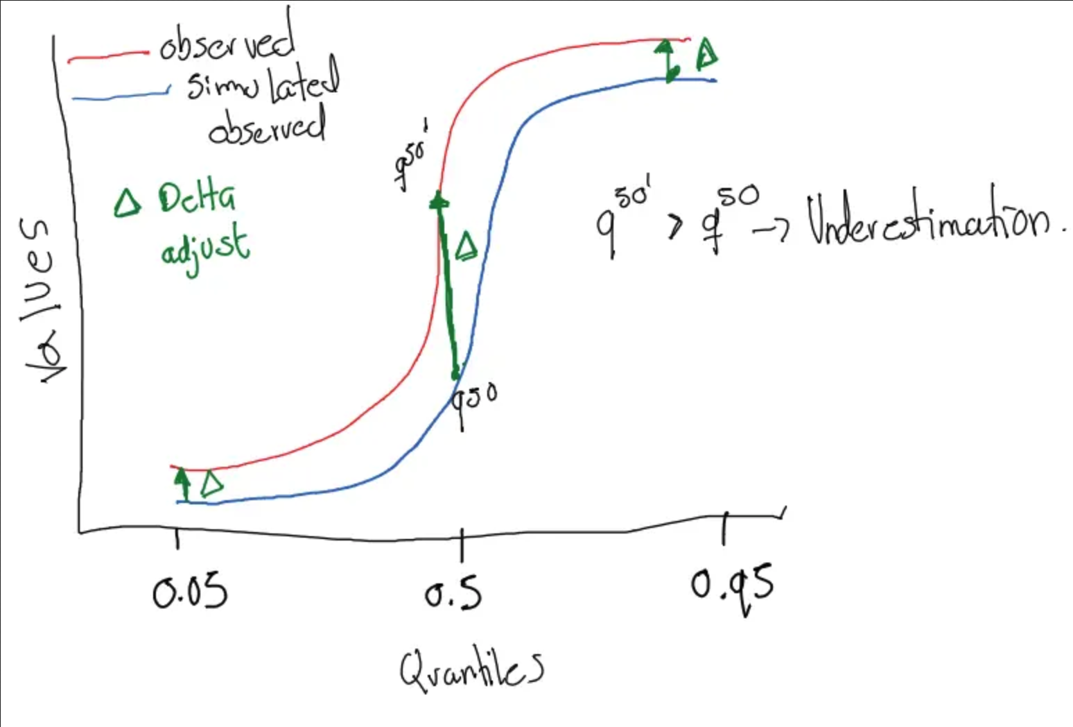 - Quick steps: find percentile of modeled future value → map to observed-hist quantile → apply modeled change at that percentile (additive/multiplicative)